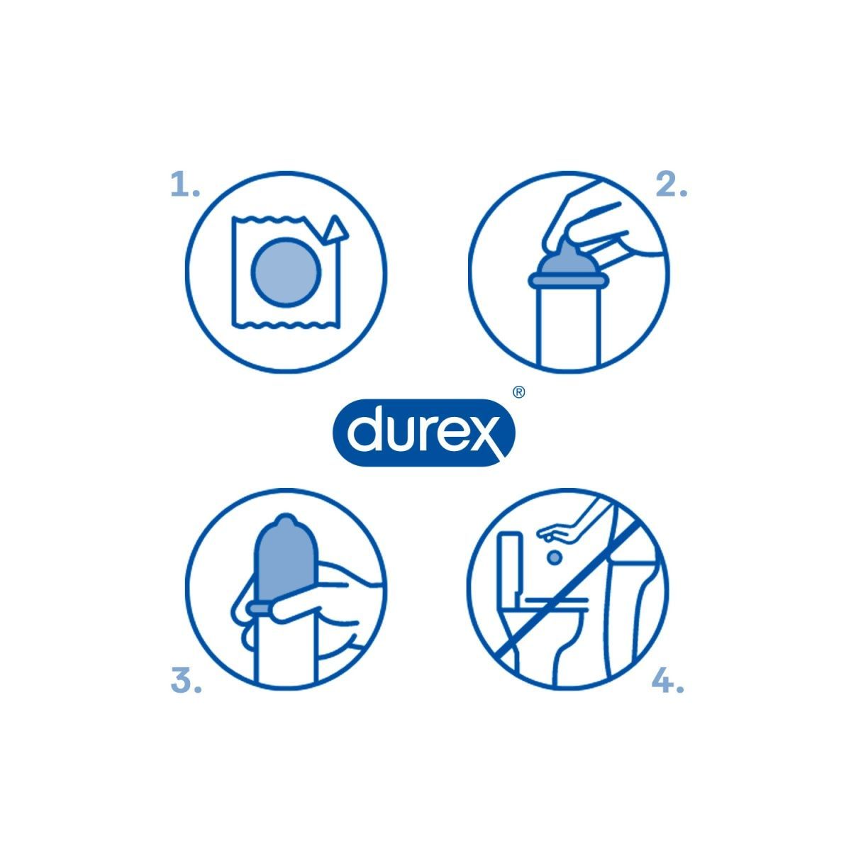 Použitie - Stlačte & pretlačte pre návod na použitie. Uzavrite pre neskoršie použitie. Starostlivo si prečítajte návod na použitie vo vnútri krabičky, najmä ak používate kondómy pre análny alebo orálny sex. Žiadna antikoncepčná metóda Vám nemôže poskytnúť 100% ochranu proti otehotneniu, HIV či iným pohlavne prenosným chorobám. Umiestnenie loga Durex na fólii Vám pomôže nasadiť kondóm správnou stranou hneď na prvý pokus. Logo indikuje spodok kondómu. Používajte iba lubrikanty odporúčané na používanie s kondómami. Pri análnom sexe použite ďalšiu lubrikáciu na vonkajšiu stranu kondómu. Kondóm je iba na jedno použitie. Vyhoďte fóliu a použitý kondóm do odpadkového koša. Nesplachujte do záchodu.