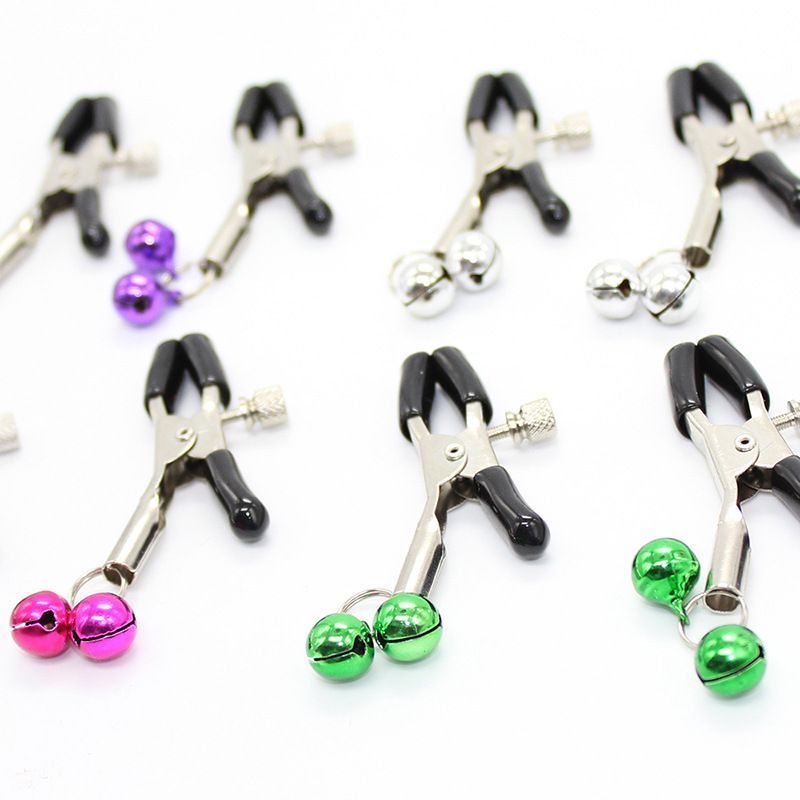 Sexy svorky na bradavky sa zvončeky. Spony pevne utiahnu bradavky a ich pevnosť je možné dodatočne upraviť pomocou kovového gombíka.